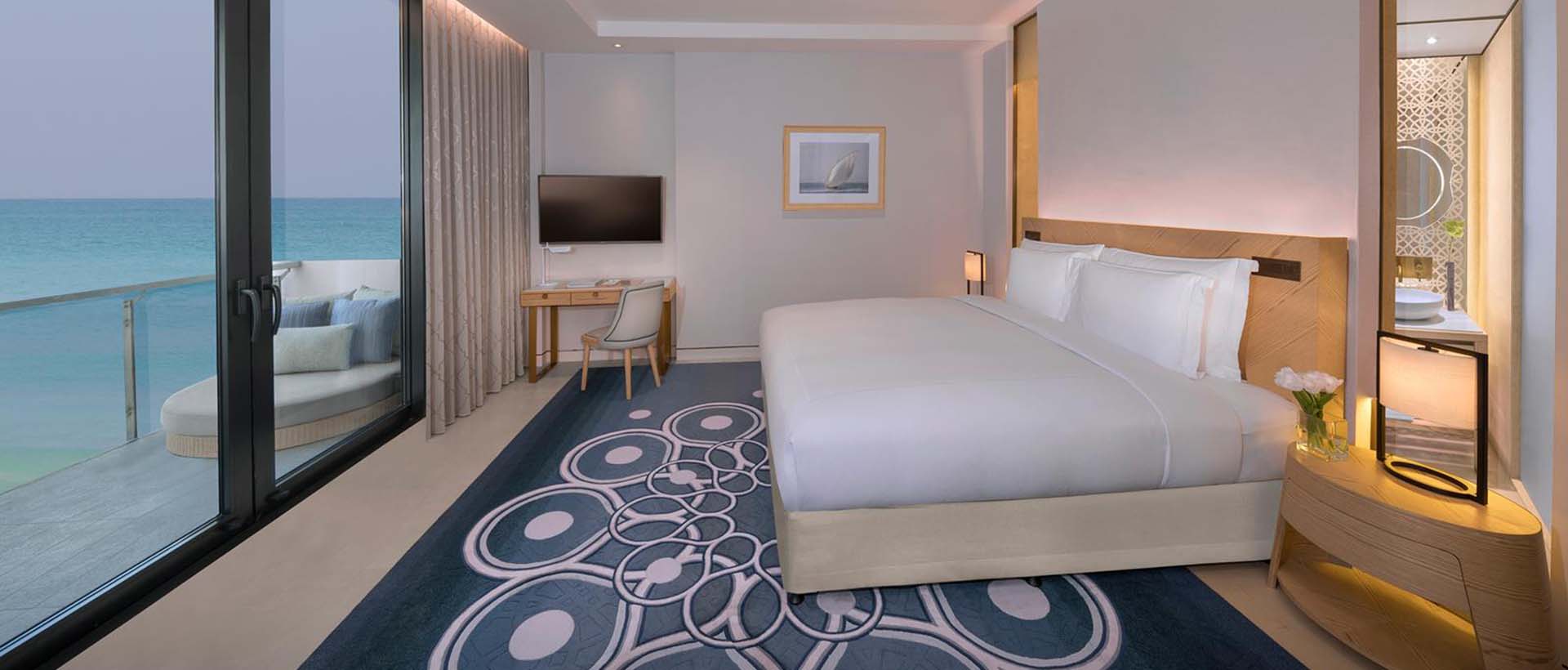 Все 293 номера отеля предлагают вид на море – любоваться пейзажем можно с балкона или просторного патио. Атмосфера сдержанной элегантности создается спокойными интерьерами в нейтральных тонах в сочетании с декором из драгоценных камней.